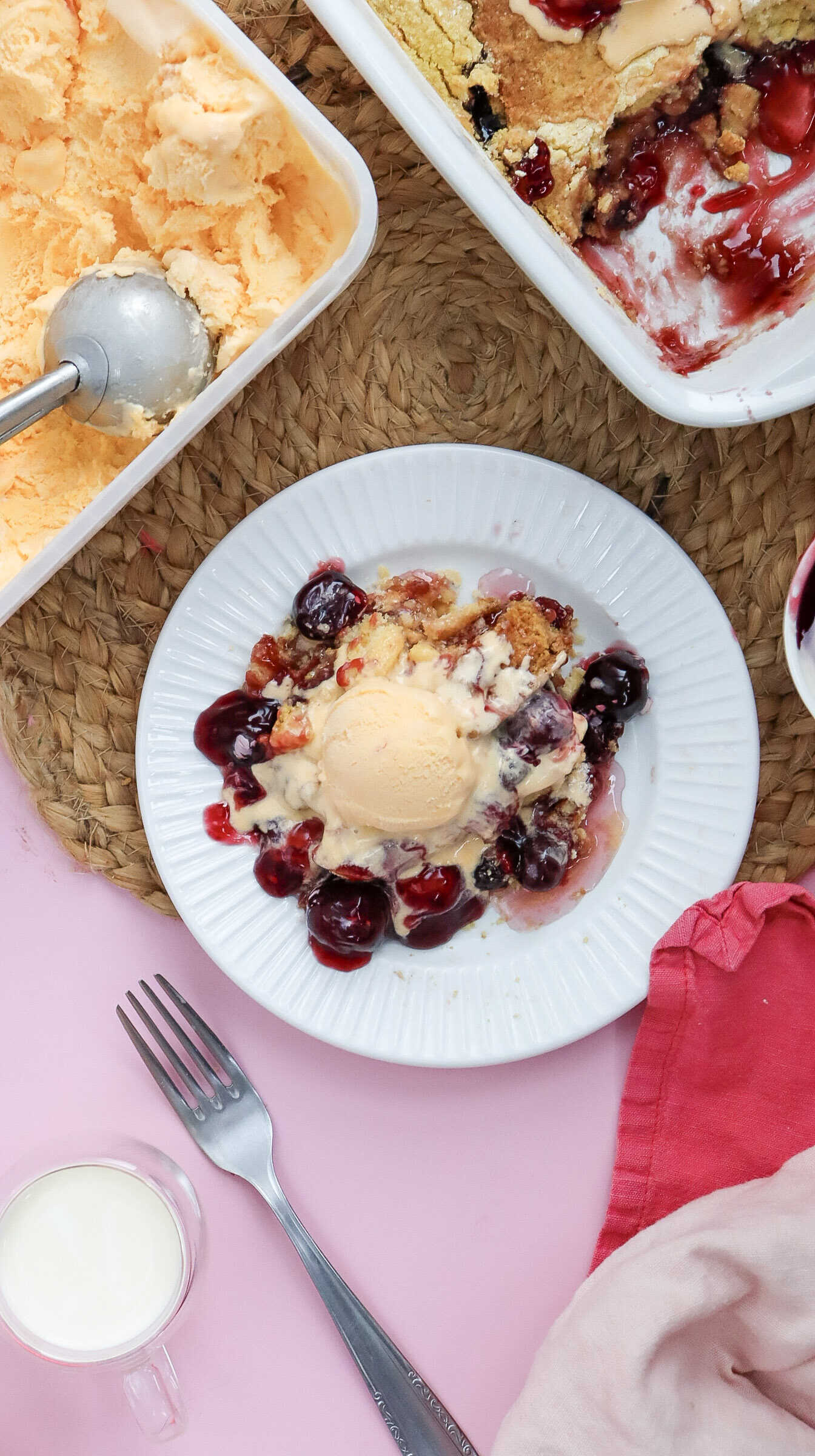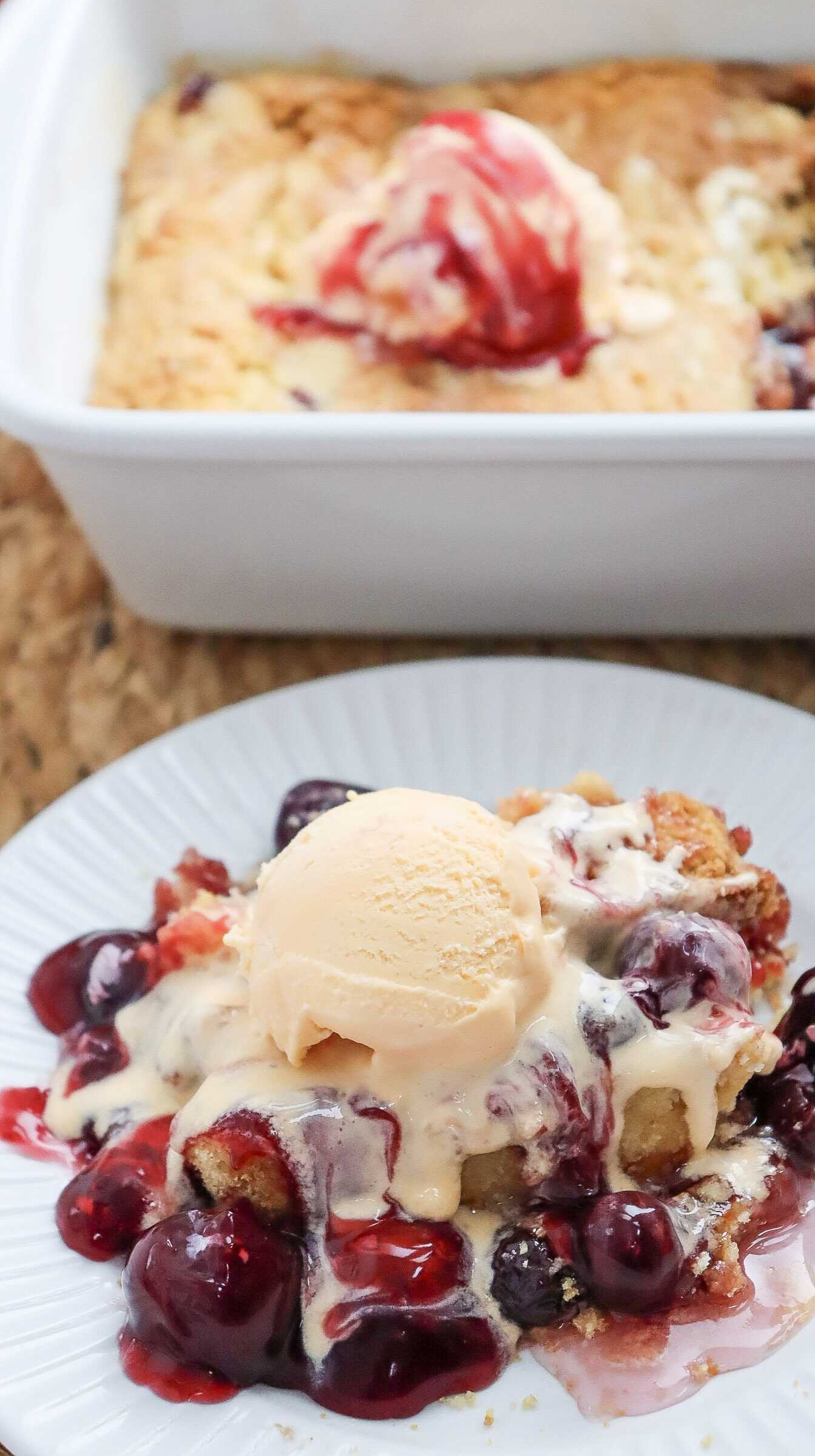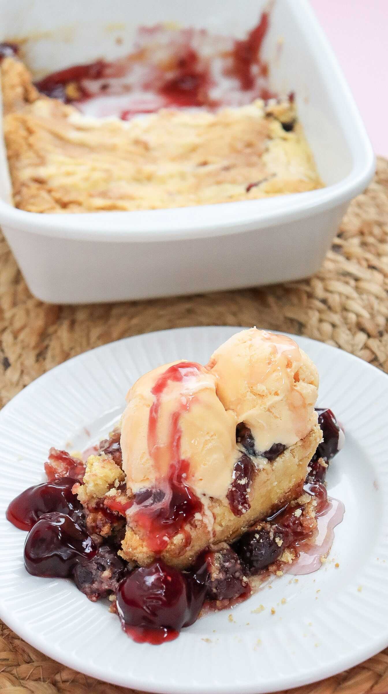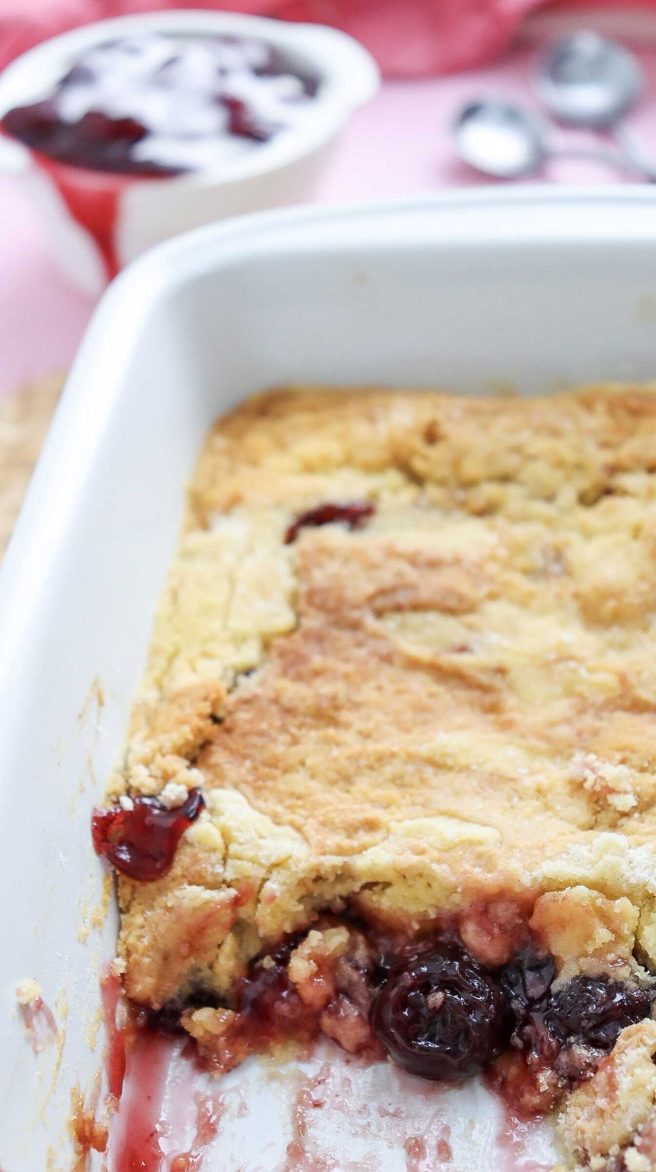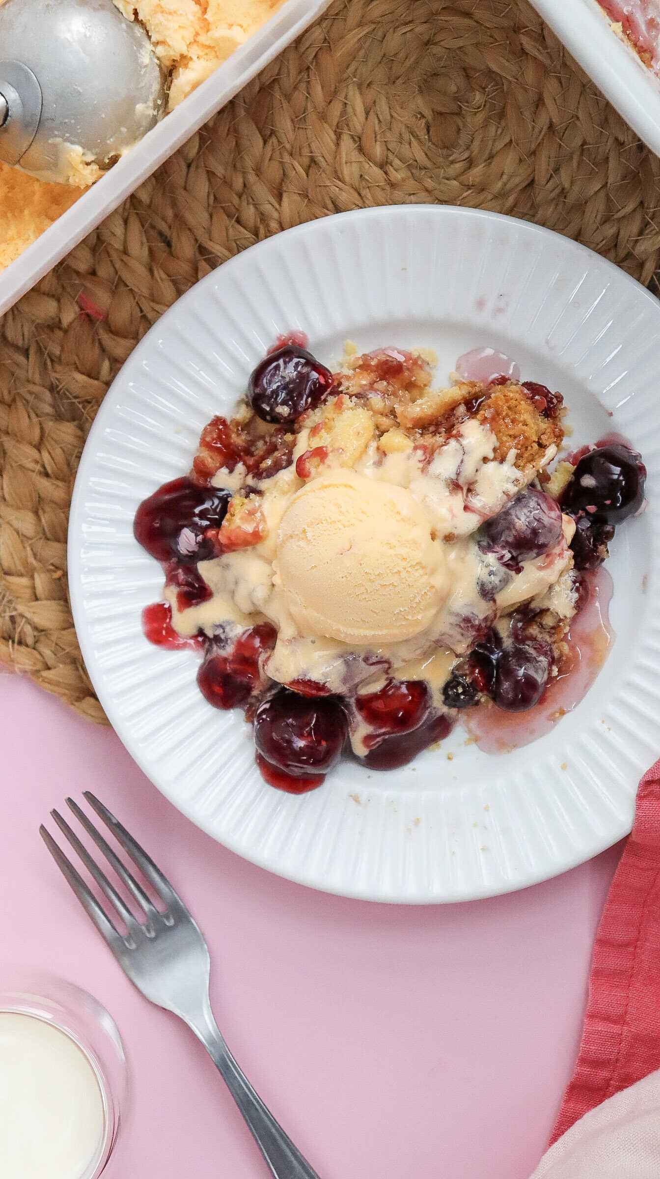 Serving cherry dump cake warm with a creamy topping takes it to the next level.