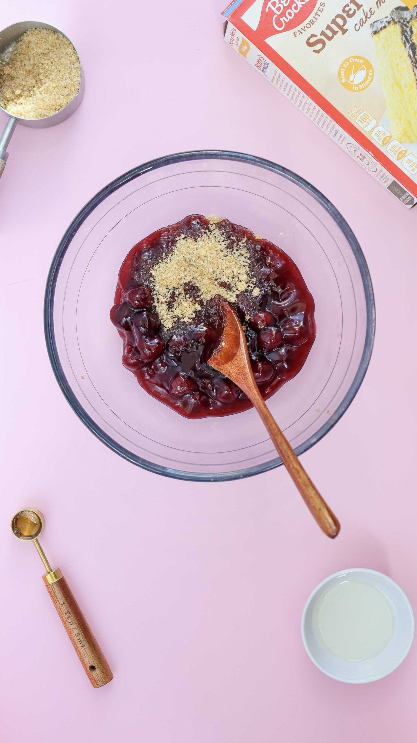 Evenly sprinkle the dry cake mix over the cherry filling. Do not stir. The dry cake mix should sit right on top of the cherries, forming the base of the topping.