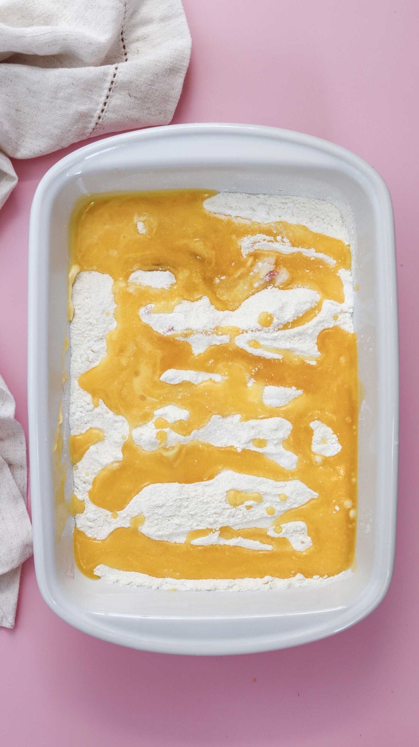 Drizzle the melted butter evenly over the cake mix, followed by the carob fruit syrup or agave syrup. Try to cover as much of the cake mix as possible so it bakes evenly and doesn’t leave dry patches.