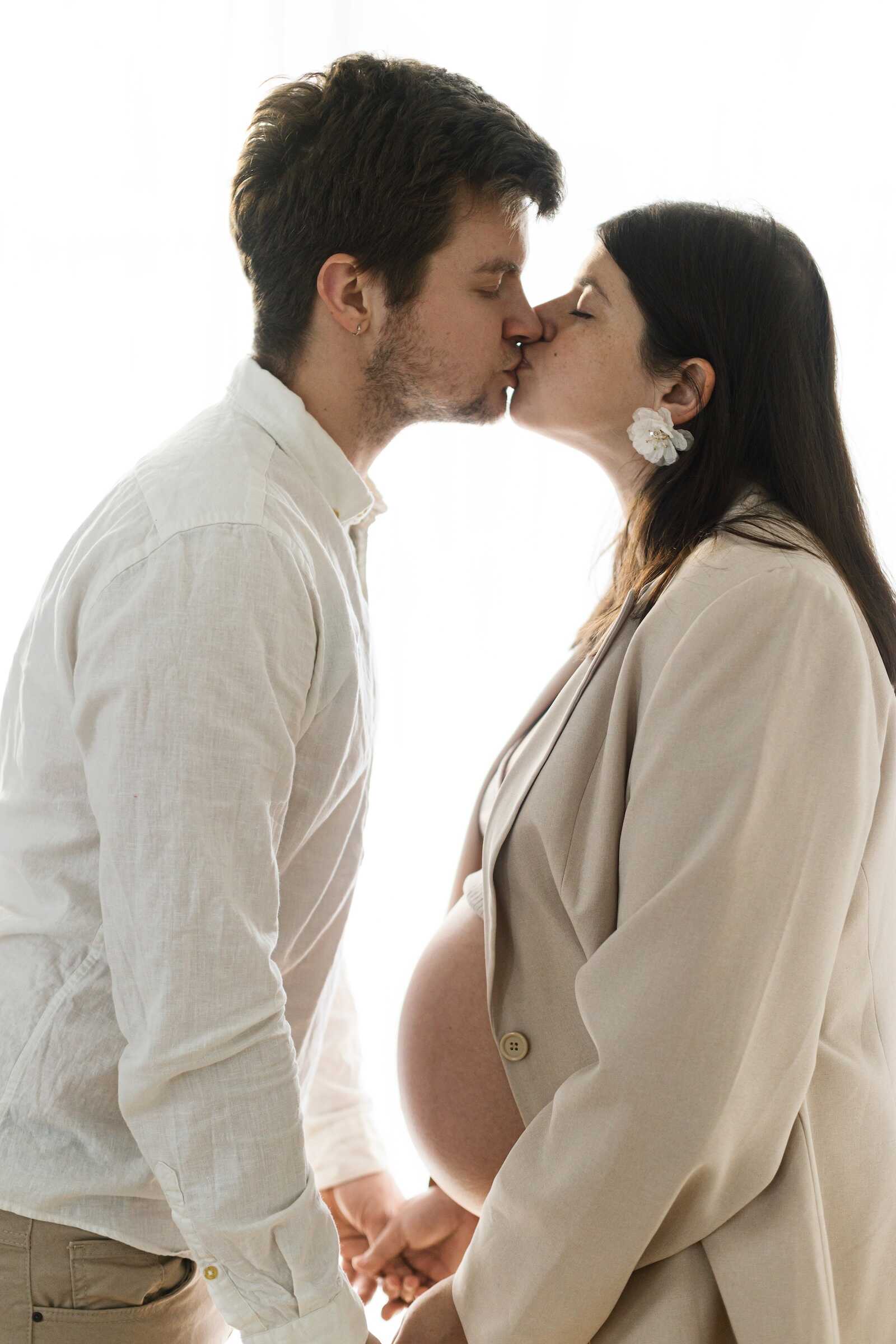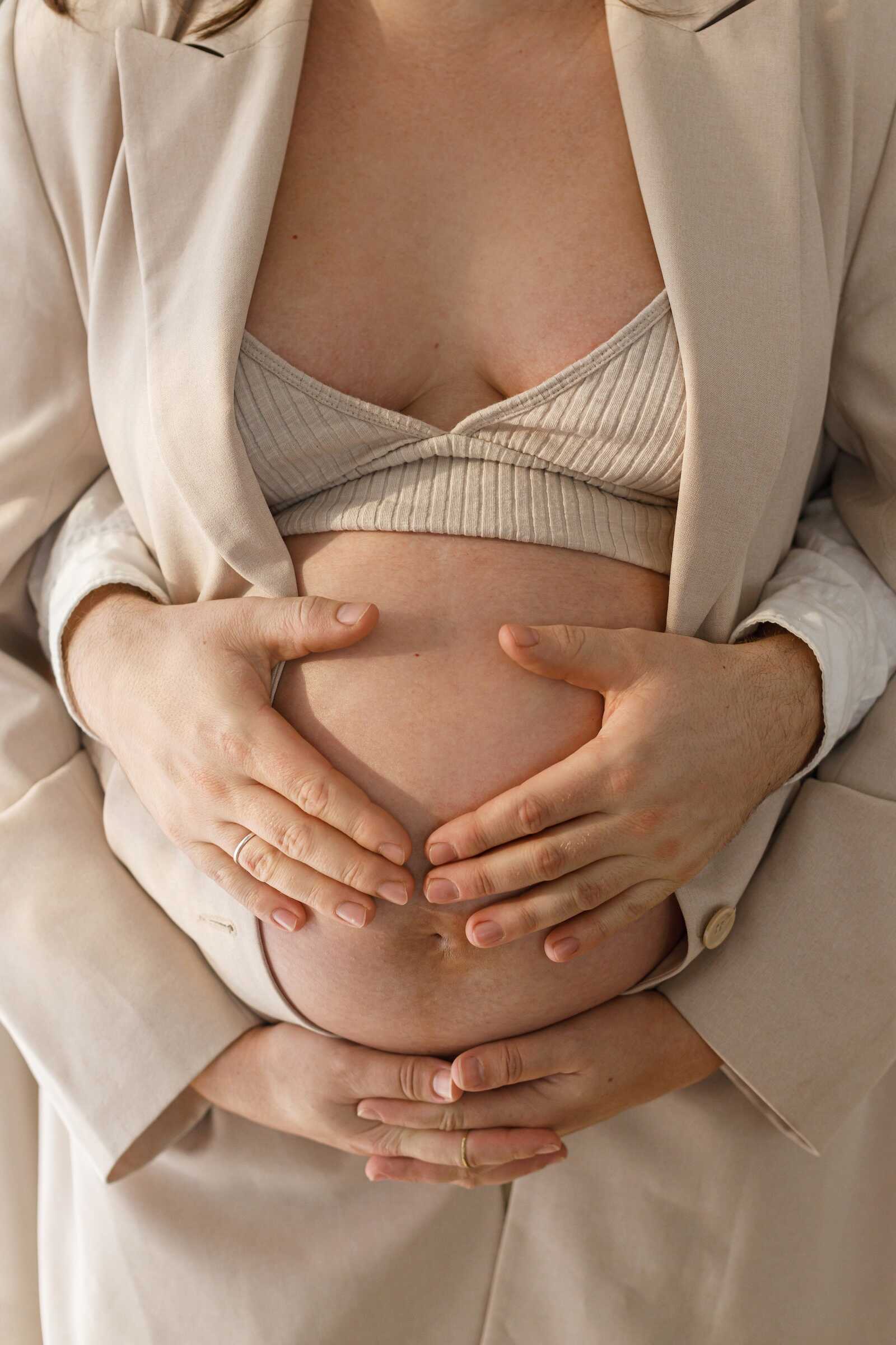 Have your partner stand behind you (see our guide to couples maternity photoshoot), arms wrapped gently around the bump. Both of you look away from the camera or at each other softly. Neutral clothing keeps the focus purely on connection.
