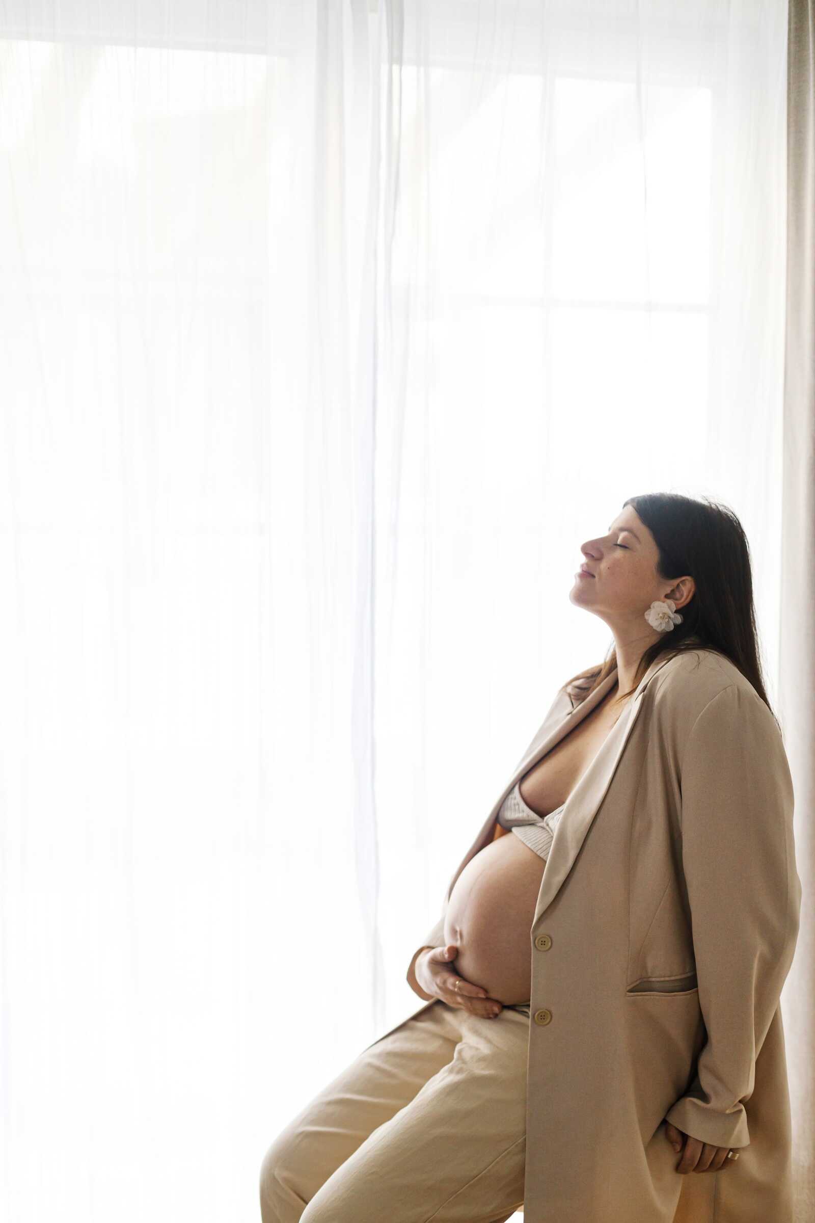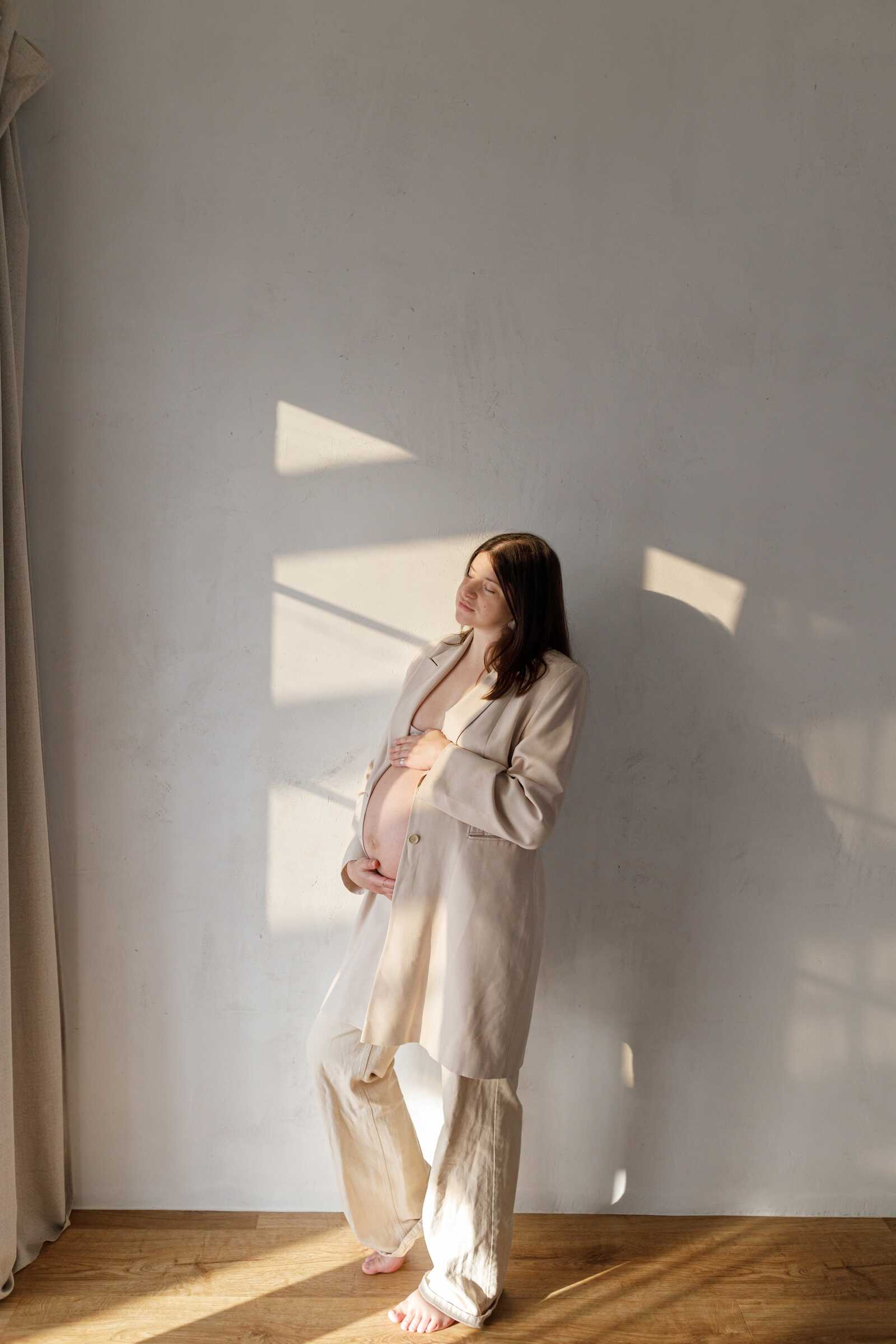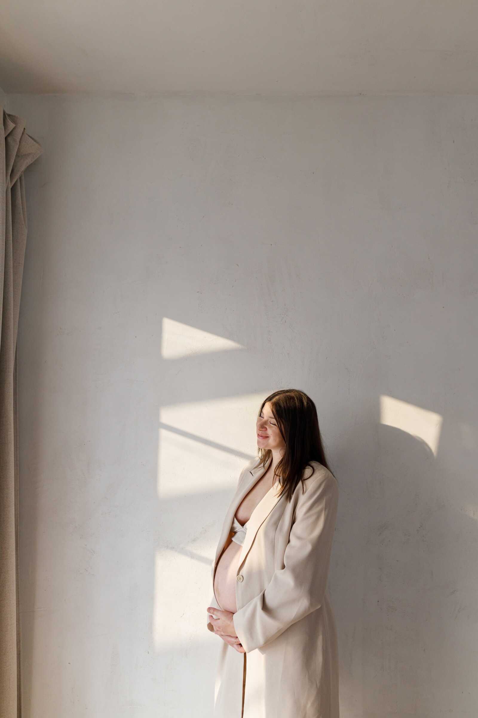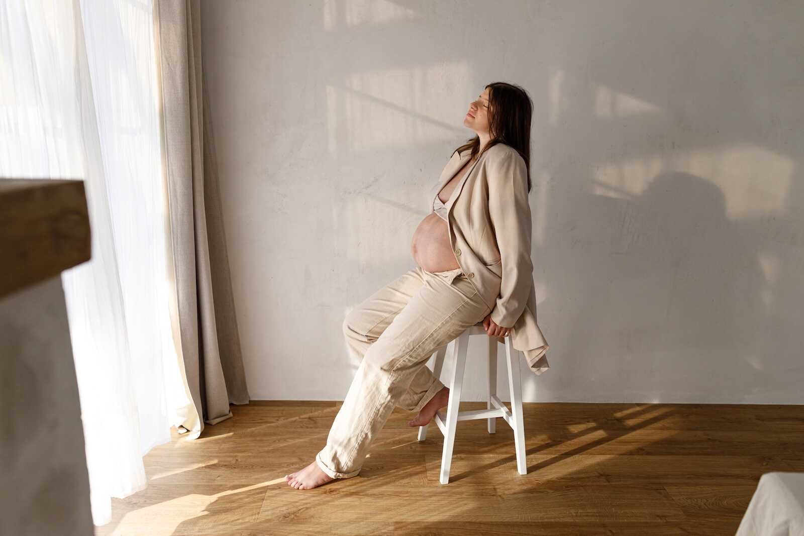 Indoor maternity photos offer privacy, comfort, and complete control over lighting. Large windows provide beautiful soft light without harsh shadows. White walls or simple curtains serve as perfect backdrops. Indoor sessions feel intimate and are ideal for moms in later pregnancy stages or during colder months. The controlled environment eliminates wind, bugs, or unpredictable weather.